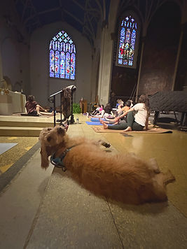 Each Wednesday we offer a free yoga class hosted by Keaton Thiel - students, faculty, and community members are welcome to join to find peace and flexibility. We provide free yoga mats and blocks if you do not have any. Lila, our Vicar of Vibes, often is there for class to offer puppy snuggles.